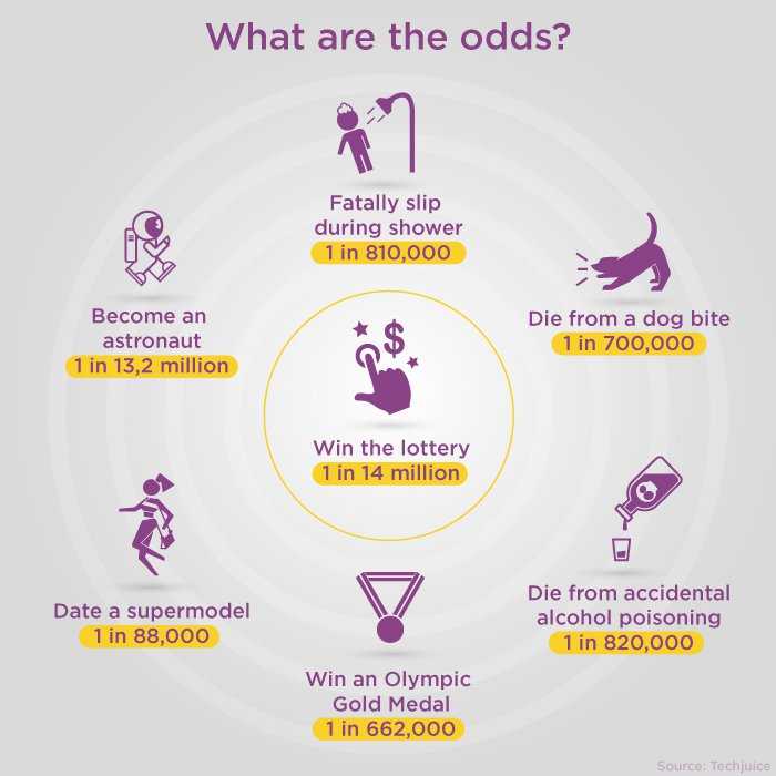 Если говорить про выигрыш в лотерею, то шанс сорвать джекпот равен примерно 1 к 14 миллионам. А шанс умереть равен примерно 1 к 9 миллионам.