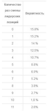 Лидер будет меняться не больше 4-х раз в 68% случаях. Вероятность смены лидера от 5 до 9 раз составит 27%, если больше 10 раз то вероятность будет 5%.