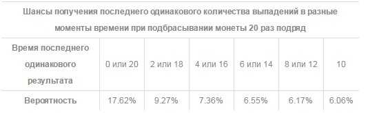 Очень многие посчитают, что равное количество выпадет где-то по середине. Но американский профессор Давид Блэквелл выяснил, что это не имеет ровным счетом никакого значения. Вероятность последнего выпадения одинакового количества «решек» и «орлов» может быть как в начале так и в конце. При том, что самая высокая вероятность будет на нулевом и 20 разе, а ближе к середине вероятность одинакового выпадения уменьшается.