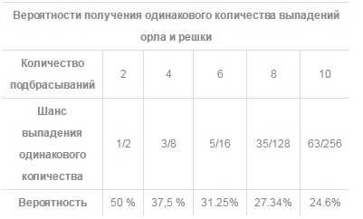 Нужно учитывать то, что при увеличении количества подбрасываний (2, 4, 6, 8 ну и т.д.) шансы выпадения одинакового количества «орлов» и «решек» увеличиваются. Ведь мы знаем, что чем больше дистанция, тем меньше удача влияет на событие.